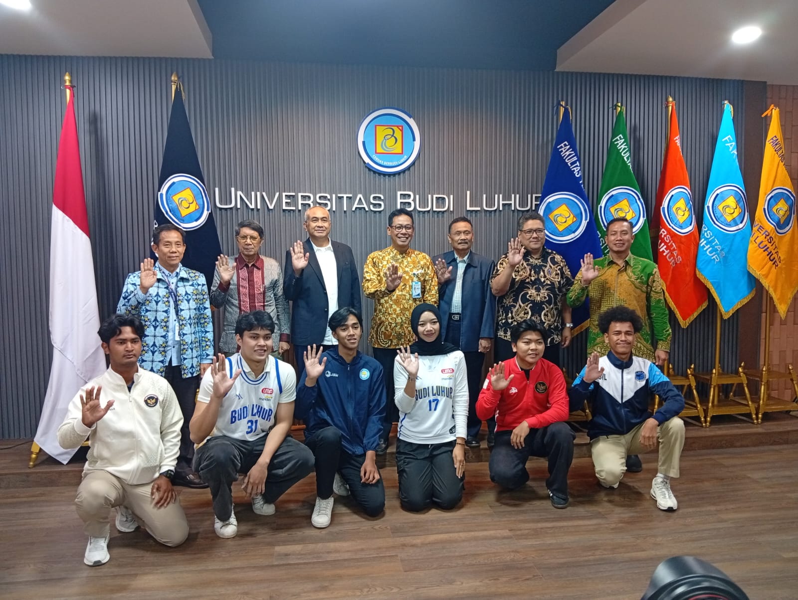 Konferensi pers dihadiri seluruh pimpinan universitas, Ketua Yayasan Budi Luhur Cakti Bapak Kasih Hanggoro, MBA, Ketua BPH Budi Luhur Cakti Bapak Julian Bongsoikrama, BA., MSc, Rektor Prof. Dr. Agus Setyo Budi, M.Sc., Deputy Akademik Dr. Ir. Deni Mahdiana, MM., M.Kom dan perwakilan mahasiswa atlet berprestasi.
